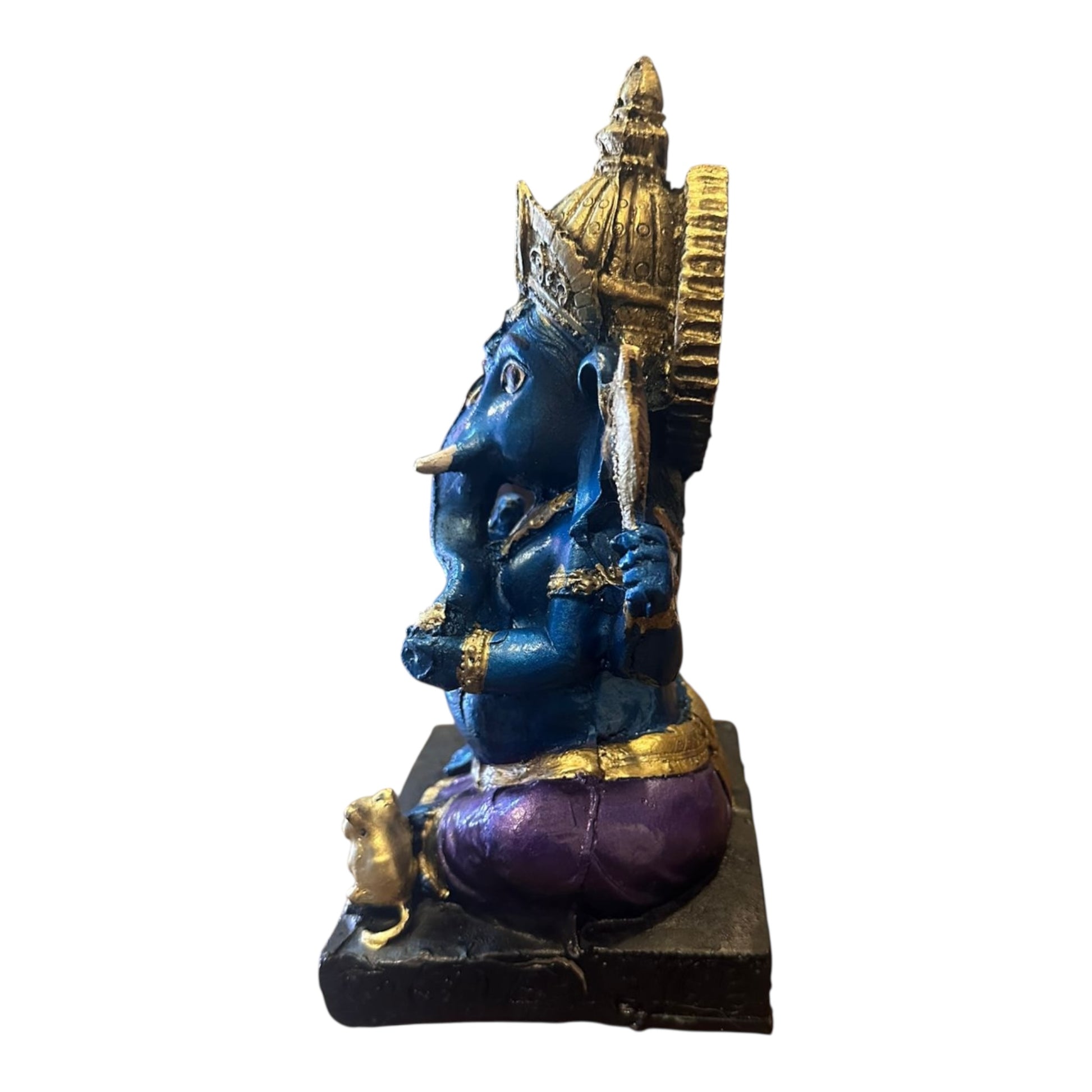Esta figura de resina de Ganesh, con una altura de 24 cm, combina tonos dorados y azules que realzan su detalle y presencia. Su acabado cuidadosamente trabajado ofrece durabilidad y un peso que aporta sensación de calidad, ideal para quienes valoran tanto el simbolismo como la estética en objetos religiosos o decorativos. Perfecta para espacios que buscan un toque de espiritualidad con estilo refinado.