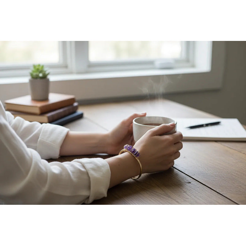 Pulsera artesanal de amatista ESPECIFICACIONES Pulsera tipo brazalete elaborada en metal, decorada con piedras de amatista natural en bruto. Diseño abierto y ajustable, ideal para lucir en cualquier ocasión. RECOMENDACIONES Perfecta para regalar o complementar tu estilo. Se recomienda evitar el contacto con agua y productos químicos para preservar el acabado y las piedras. DETALLES DE DISEÑO El brazalete cuenta con un acabado metálico brillante y piedras de amatista sujetas con alambre, brindando un toque único y elegante.